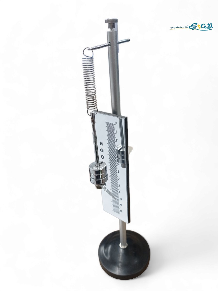 - مسطرة مدرجة (بمرآة): تُستخدم لقياس طول الزنبرك. وجود المرآة خلف التدريج يساعد في أخذ قراءة دقيقة جداً عبر محاذاة عين المستخدم مع المؤشر وصورته في المرآة لمنع الخطأ البصري.